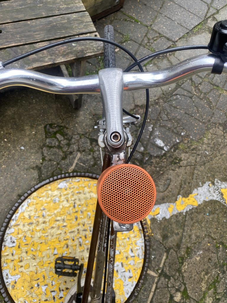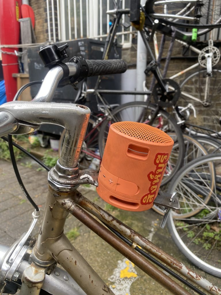 It was a complete fail. I don’t know bikes well, so I unscrewed the wrong thing, and I lost a lot of ball bearings. James brought up the saying: to loose ones bearings. Jokes! I am lost. (I had to have it fixed) Then it resonates too much, the metal buzzing is louder than the actual music 😐 I tried resolving this with some rubber tape and a magnet, but the base is too powerful.